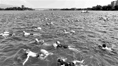 9月20日,廣西壯族自治區(qū)柳州市融安縣舉行主題為“千人游融江·勞模引風(fēng)尚”的千人橫渡融江活動(dòng),游泳愛好者匯聚在江邊,共赴一場“橫渡之約”,一起參加保護(hù)母親河行動(dòng),倡導(dǎo)低碳出行。圖為游泳愛好者正在橫渡融江。譚凱興 攝