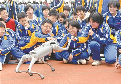10月23日,河北省邯鄲市永年區(qū)科協(xié)邀請邯鄲市科協(xié)開展“科普大篷車”進校園活動。科普志愿者走進轄區(qū)實驗中學,通過科學小實驗、機器狗表演、科普設(shè)備展示等方式,讓學生們在快樂體驗中學科學、愛科學、用科學,近距離感受科技的魅力,激發(fā)他們創(chuàng)新創(chuàng)造意識和科學探索精神。圖為10月23日,在河北省邯鄲市永年區(qū)實驗中學,學生正在與機器狗互動。胡高雷 攝