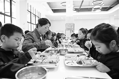 重慶沙坪壩區(qū)樹(shù)人和平小學(xué)以校長(zhǎng)教師陪餐、師生同隊(duì)打飯、家長(zhǎng)輪流進(jìn)校陪餐為切入點(diǎn),借 “互聯(lián)網(wǎng) + 明廚亮灶” 緊盯食堂 16 個(gè)關(guān)鍵環(huán)節(jié),讓陪餐成為校園食安 “監(jiān)督崗” 與家校 “連心橋”,打造家校滿意的 “陽(yáng)光食堂”。圖為11月4日,樹(shù)人和平小學(xué)校長(zhǎng)陪學(xué)生們吃午餐。孫凱芳 攝