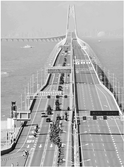 11月8日10時24分,選手通過港珠澳大橋白海豚人工島。 南方日報記者 張由瓊 姚志豪 石磊 蘇韻樺 董天健 關銘榮 攝