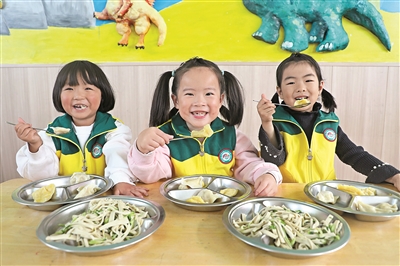 11月7日立冬。河北省唐山市豐潤區(qū)多地幼兒園開展包餃子活動,小朋友在老師的指導(dǎo)下學(xué)習(xí)包餃子、煮餃子,體驗傳統(tǒng)民俗文化。圖為11月5日,在左家塢鎮(zhèn)中心幼兒園,小朋友開心地吃餃子。