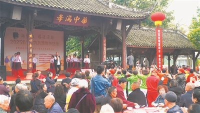 上午10點(diǎn),“千叟宴”尚未開(kāi)始,仁孝廣場(chǎng)上已經(jīng)熱鬧起來(lái):“德孝”主題的文藝節(jié)目輪番上演,精彩紛呈;書(shū)畫(huà)志愿者現(xiàn)場(chǎng)創(chuàng)作蘊(yùn)含“孝”意的書(shū)法作品贈(zèng)予現(xiàn)場(chǎng)群眾;攝影志愿者為村民拍攝全家福,定格一張張幸福笑臉。而在廣場(chǎng)一側(cè)的新時(shí)代文明實(shí)踐陣地——邛崍市當(dāng)代孝道文化博物館里,數(shù)十名學(xué)生認(rèn)真抄寫(xiě)《孝經(jīng)》,不少村民、游客在這里了解當(dāng)代孝子的感人故事,傳承弘揚(yáng)德孝文化。據(jù)介紹,當(dāng)代孝道文化博物館自2014年重陽(yáng)節(jié)創(chuàng)立以來(lái),秉持“傳播孝道文化、促進(jìn)社會(huì)和諧”的宗旨,以文字、圖片、影像、實(shí)物等形式集中展現(xiàn)當(dāng)代孝子的感人故事,并免費(fèi)開(kāi)放。截至目前,累計(jì)接待游客70萬(wàn)余人次。
