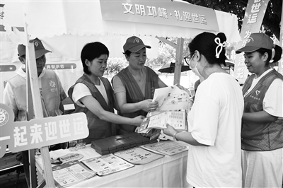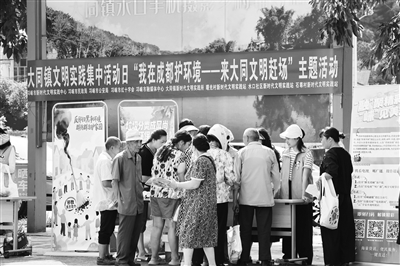 市民在文君街道“文明集市”學(xué)習(xí)世運知識。