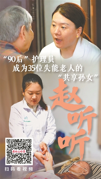 有一次,趙聽聽穿著破洞牛仔褲去給患尿毒癥的徐阿婆護理,阿婆看到她的膝蓋露在外面以為是褲子破了沒人補,心疼地找來一塊顏色一樣的布縫上。2020年春節(jié),趙聽聽回鄉(xiāng)探親。其間,她接到徐阿婆兒子的視頻電話,屏幕上她看到阿婆吃力地叫著:“聽聽啊,我終于看到我的孫女了!”可沒想到再次通話時,卻是徐阿婆過世的消息。這也成了她從事護理工作以來最大的遺憾。“從那以后,我再也沒有離開過上海的老人?!壁w聽聽說。