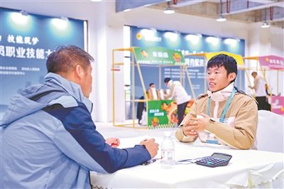 騎手趙明陽(右)參加2025年四川省網(wǎng)約配送員職業(yè)技能大賽,進(jìn)行現(xiàn)場(chǎng)答辯。(受訪者供圖)