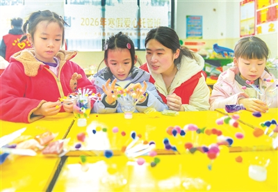寒假期間,湖南省永州市道縣開展“共青團·伙伴計劃”寒假愛心托管項目,發(fā)動返鄉(xiāng)大學生志愿者參與托管服務,面向網(wǎng)約車司機、外賣配送員等新就業(yè)群體勞動者子女,提供暖“新”看護服務,通過開設心理健康課、趣味手工等課程,讓孩子們度過一個快樂寒假。圖為1月28日,道縣第四小學,志愿者和孩子們一起制作手工作品。蔣克青 攝