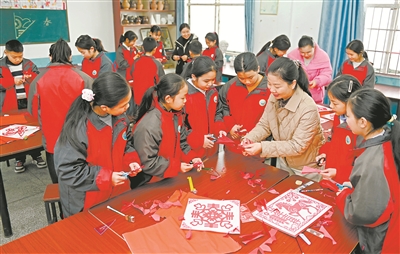近年來,湖南省邵陽市洞口縣將剪紙、書法、古箏等中華優(yōu)秀傳統(tǒng)文化項(xiàng)目引入課后服務(wù)活動(dòng),豐富學(xué)生課后生活。圖為洞口初級(jí)中學(xué)的老師傳授剪紙技法。 滕治中 攝