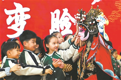 春節(jié)將至,山東省棗莊市市中區(qū)文化路絲雨幼兒園開展“品民俗 迎新春”活動(dòng),讓孩子們?cè)谖椠垺⒆兡樀蓉S富多彩的民俗體驗(yàn)中感受文化魅力。圖為1月26日,民間藝人在表演變臉時(shí)與小朋友互動(dòng)。
