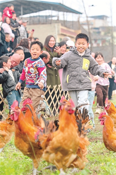 近日,四川省華鎣市古橋街道在回龍村舉辦“福馬當先,2026新征程”主題活動,孩子們和父母一起,參加抓雞、套圈、袋鼠跳、趕小馬等趣味項目。圖為孩子們參加抓雞比賽。邱海鷹 攝