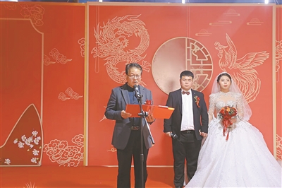 石炳啟在“紅事大廳”為新人證婚。(受訪者供圖)