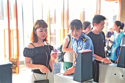 杜京林(左二)幫助旅客檢票。(首都文明辦供圖)