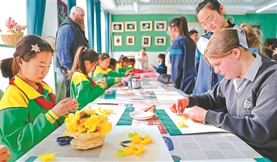 3月10日,河北省秦皇島市海港區(qū)杜莊學(xué)區(qū)第一小學(xué)迎來英國友好學(xué)校師生代表團(tuán)來訪交流?;顒又?,雙方共同欣賞文藝節(jié)目、參觀校園美術(shù)社團(tuán),并共同品嘗特色美食桲欏葉餅,通過豐富多彩的互動形式,為中外青少年搭建起溝通互動的友誼橋梁,讓學(xué)生在沉浸式體驗中感受兩國文化魅力。圖為英國友好學(xué)校師生代表團(tuán)成員體驗制作棉花畫。曹建雄 攝