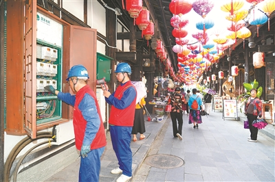 2025年國(guó)慶期間,國(guó)家電網(wǎng)四川電力(德陽(yáng)孝泉)連心橋共產(chǎn)黨員服務(wù)隊(duì)隊(duì)員在熱門景區(qū)半邊街,對(duì)供電線路、配電設(shè)施開展特殊巡視。楊劉欣 攝