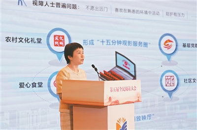 王明麗分享“光明影院”視障群體無(wú)障礙觀影公益項(xiàng)目。漆世平 攝